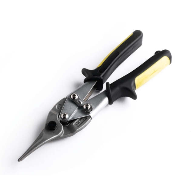 High quality snips with alloy steel handles and hot forged molybdenum steel blades. Makes straight cuts 1-1/2" long in metal up to 18 Gauge (.049") thick. Has vinyl grips for comfort.